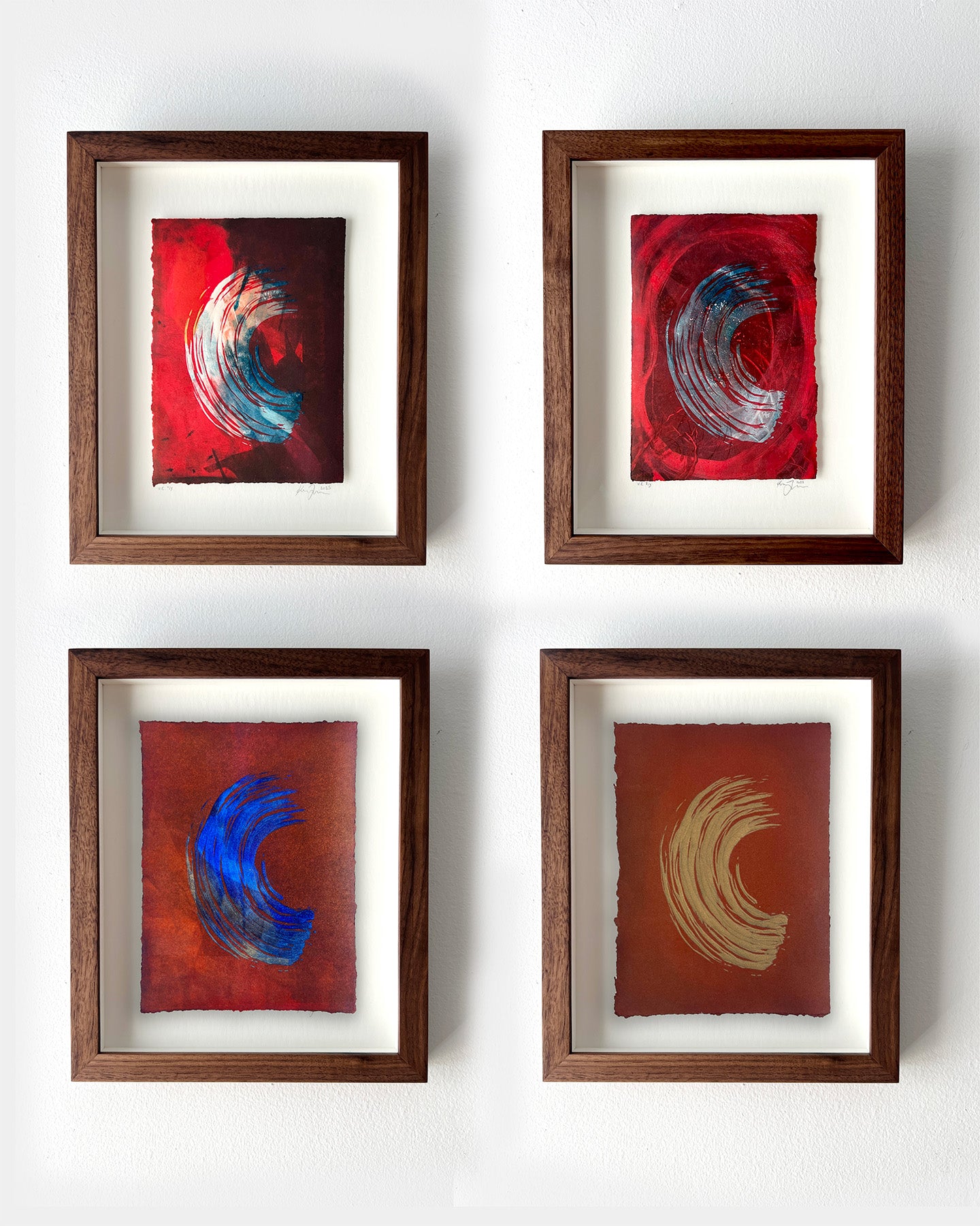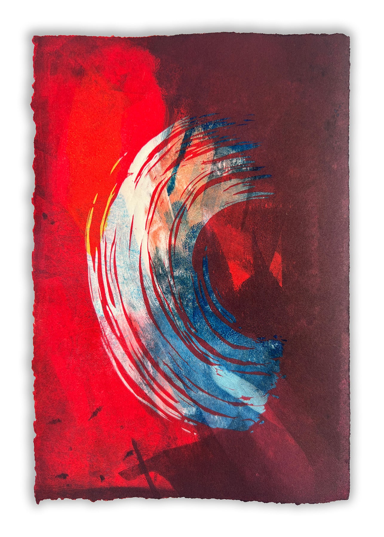 About the 'Brushstroke' Series: carved gestures are overlayed onto painterly monotype layers—fragments of color and form revealed like memories breaking through. Brushing past the haze of everyday life, these pieces reach for vivid, felt moments—an emotional texture, a flicker of memory—made visible through ink, pressure, and time.