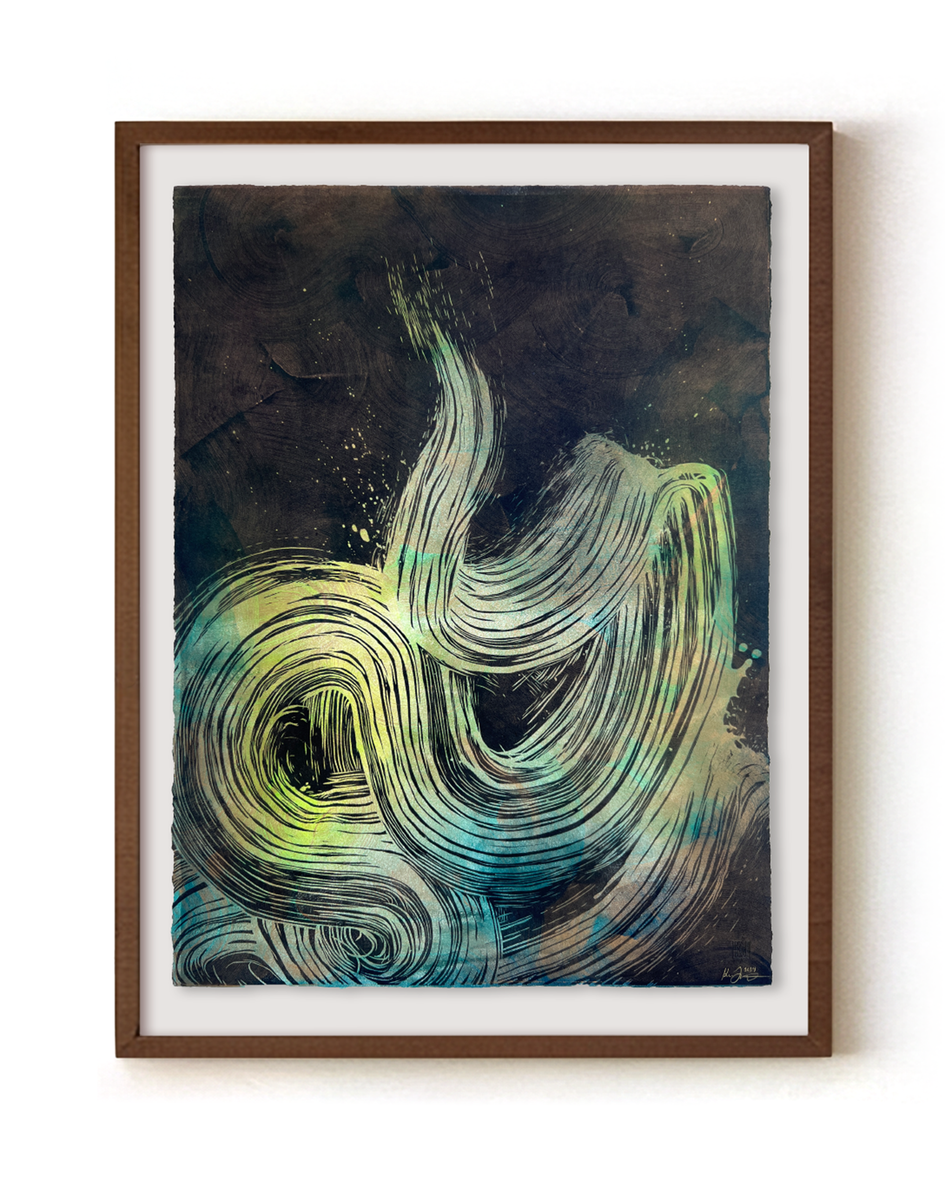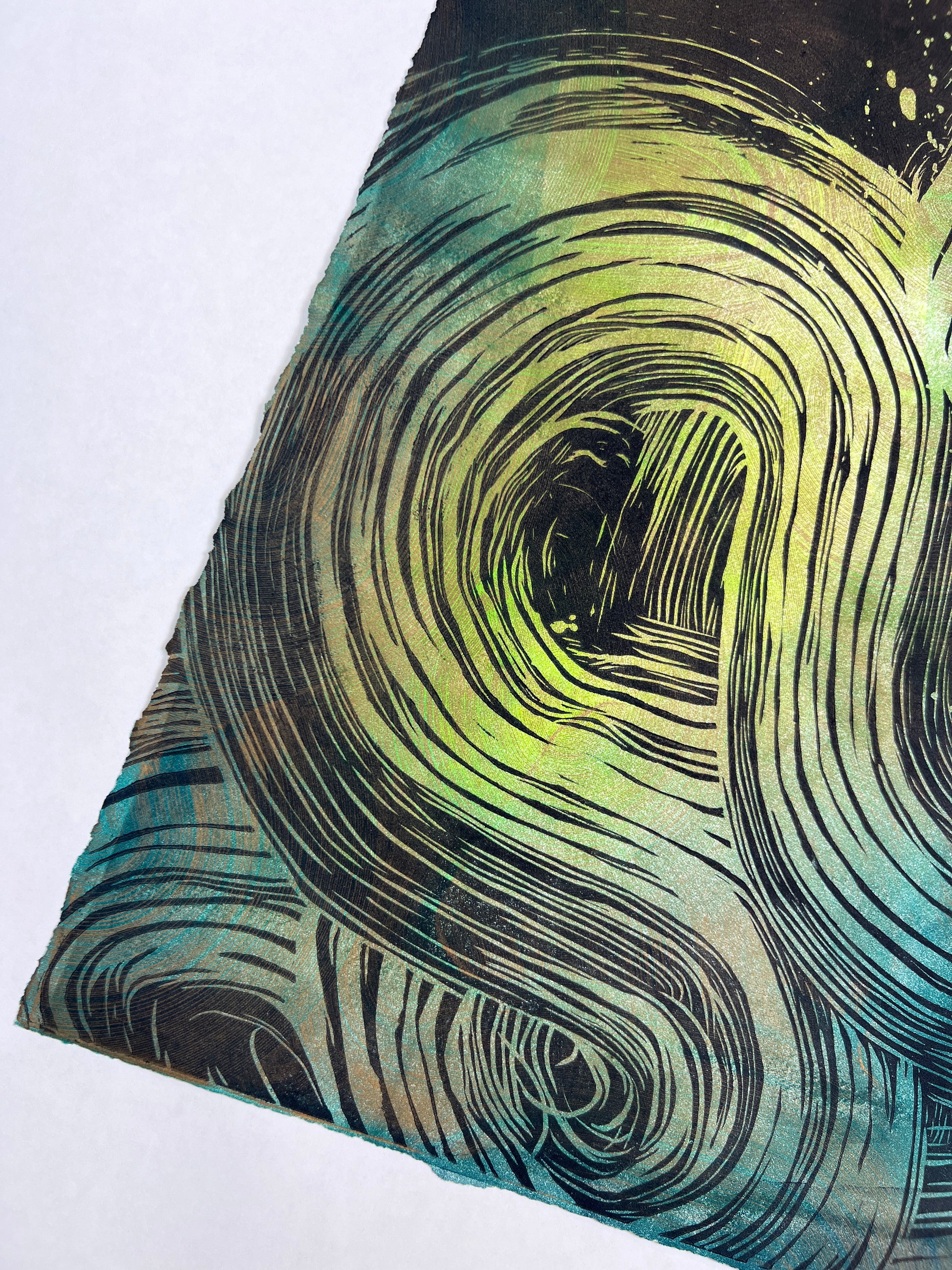 About the 'Brushstroke' Series: carved gestures are overlayed onto painterly monotype layers—fragments of color and form revealed like memories breaking through. Brushing past the haze of everyday life, these pieces reach for vivid, felt moments—an emotional texture, a flicker of memory—made visible through ink, pressure, and time.
