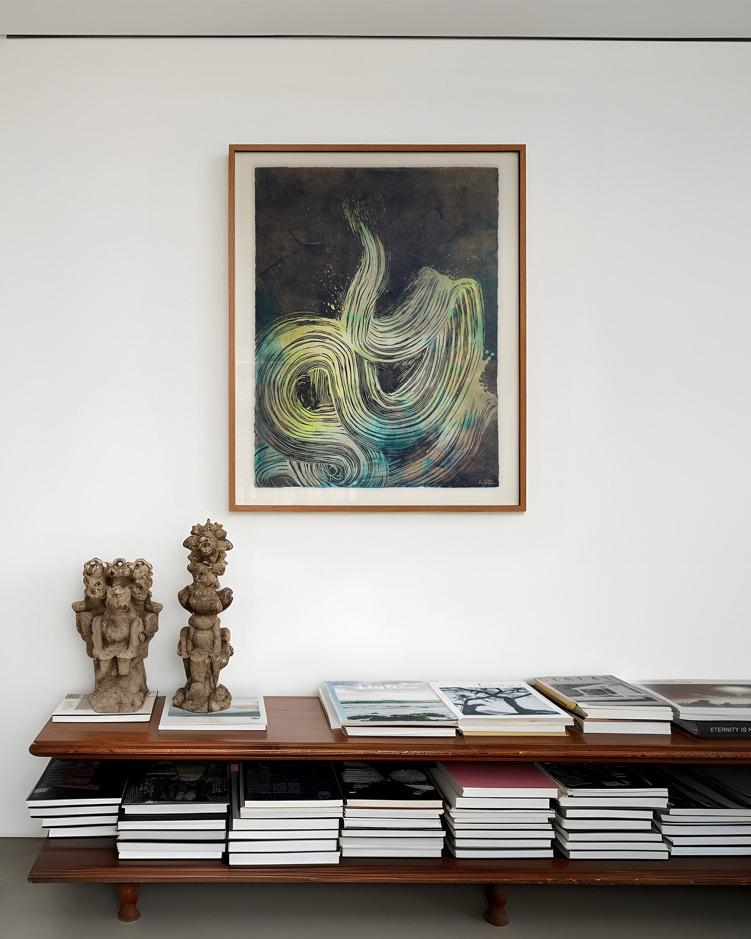 This one-of-a-kind variable edition print consists of a free-hand monotype under-layer with a hand-carved linoleum "brushstroke" 3D embossed overlay. Within this very limited variable edition of five, each color-way is singular. This unique technique was developed by the artist over a period of six intense months of trial and error in her Los Angeles studio. Once the edition sells out, it's gone for good.