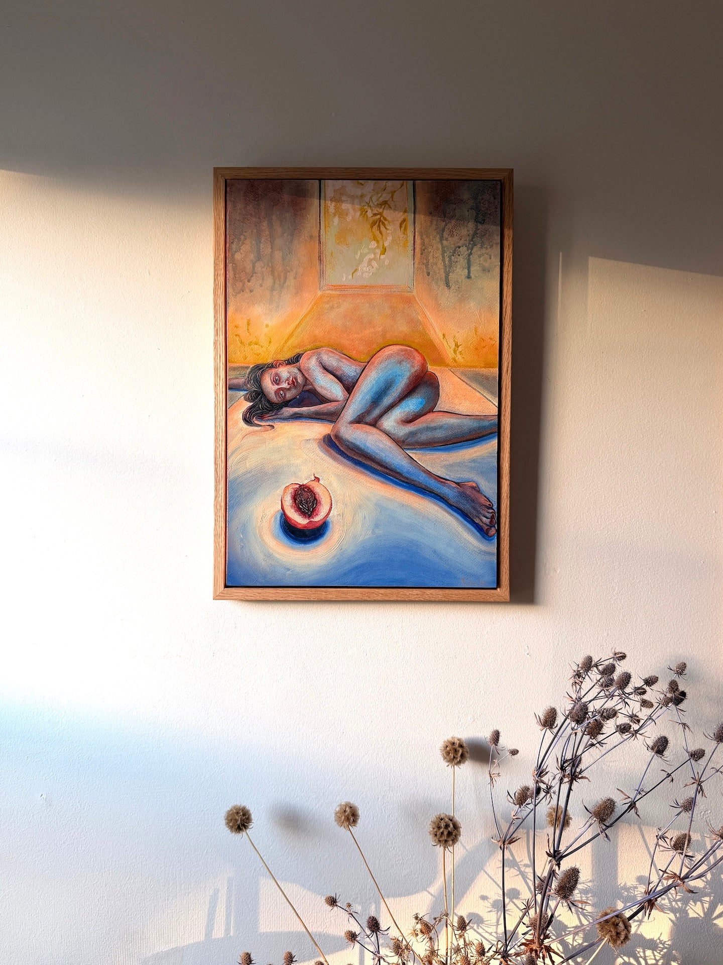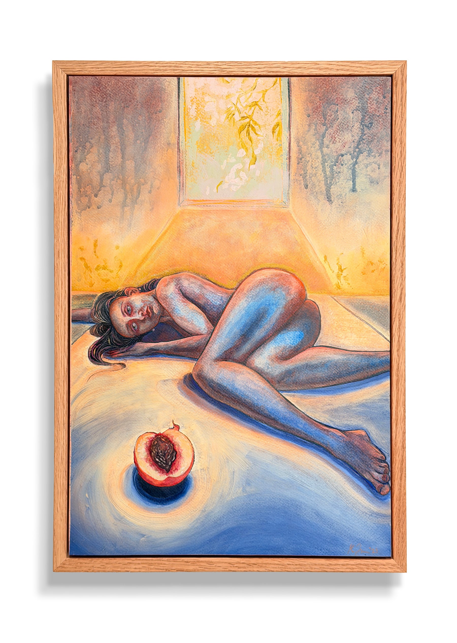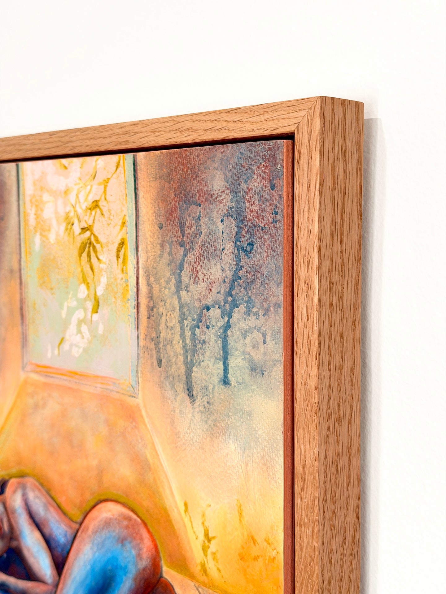 Original acrylic and oil stick painting on watercolor paper, mounted to wood panel. Framed in a hand-made red oak floater frame crafted by the artist.