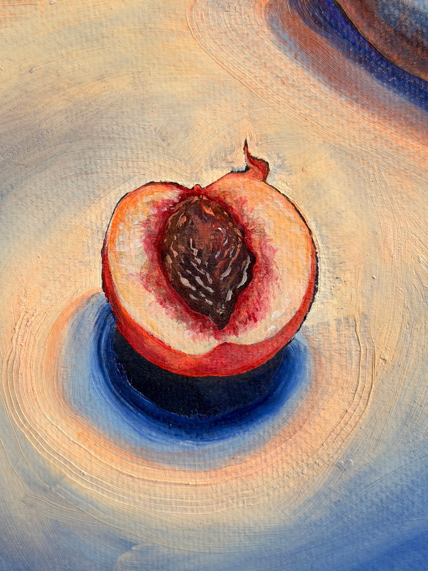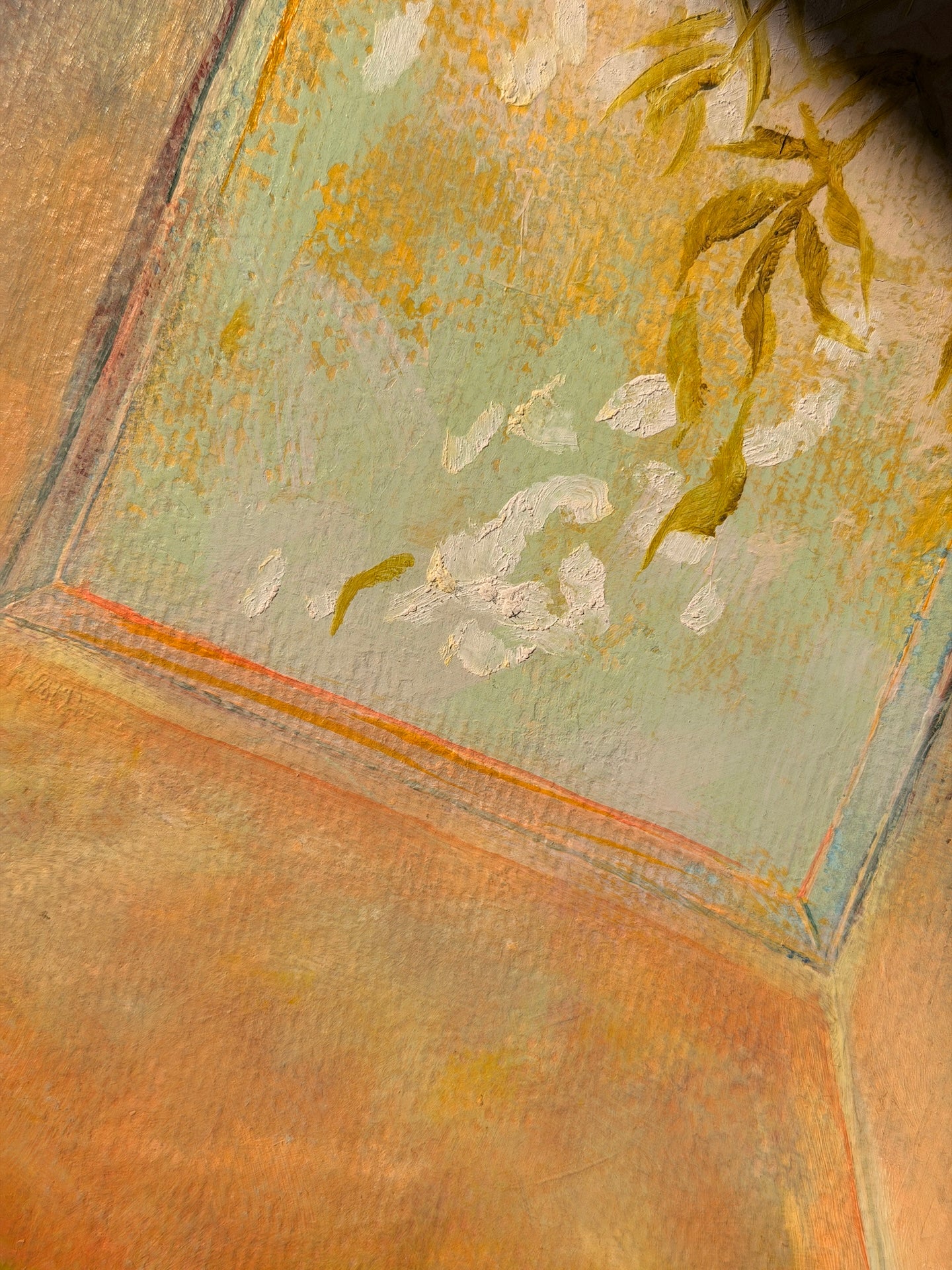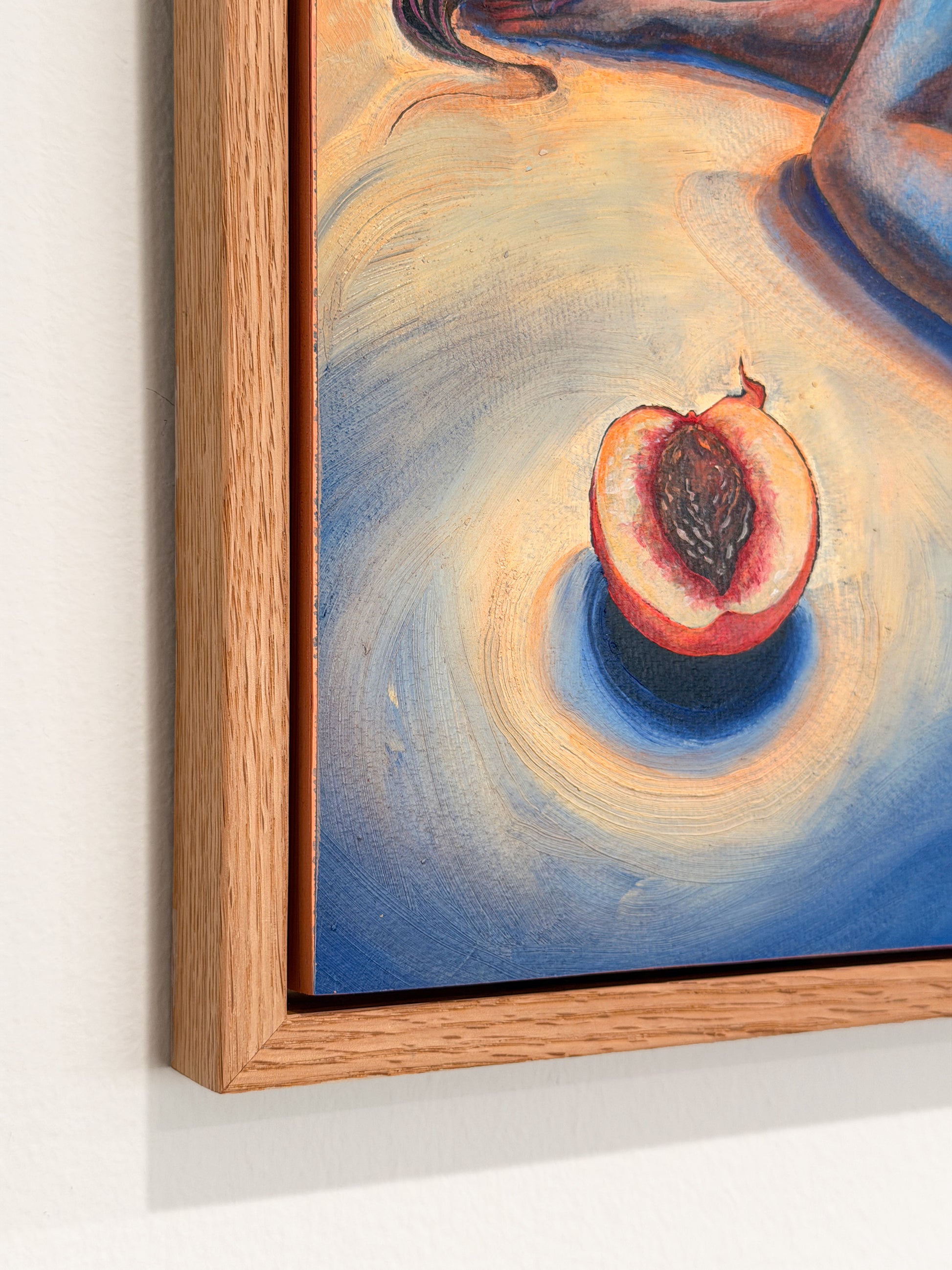 Original acrylic and oil stick painting on watercolor paper, mounted to wood panel. Framed in a hand-made red oak floater frame crafted by the artist.